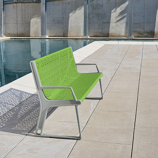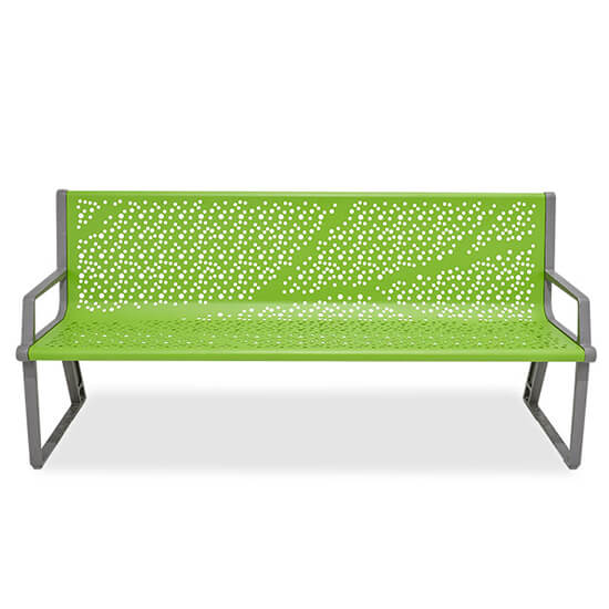 The Airi Leaf contour bench showcases modern form with a unique feel. The laser-cut architectural tree line design offers a high-end look for steel commercial benches.