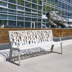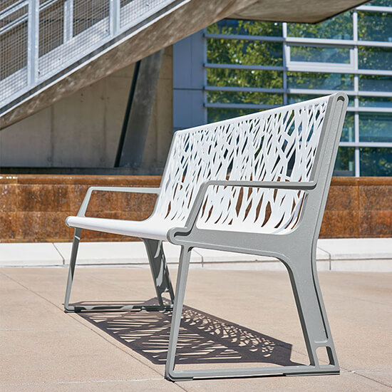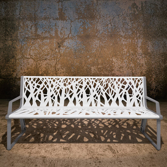 Organically modern, the Airi Stix contour bench showcases contemporary form. The unique architectural tree line design offers a high-end look. This laser-cut steel bench is both chic and long-lasting.