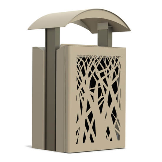 Choose the Airi Stix Recycler with curved canopy as a fresh take on a bonnet top recycler. Made with powder-coated steel laser-cut to have an organic tree design, this recycler brings together industrial and natural elements. You get the best of commercial durability with a nature-inspired design for an attractive unit in the Airi Stix Recycler. The curved canopy keeps out the elements while encouraging recycling with a large opening.