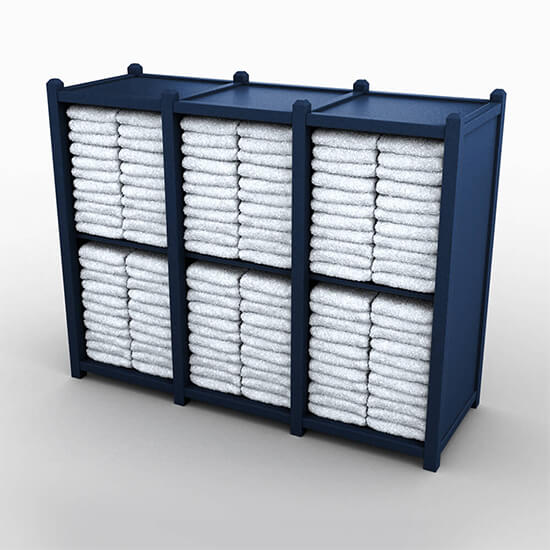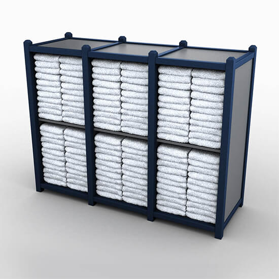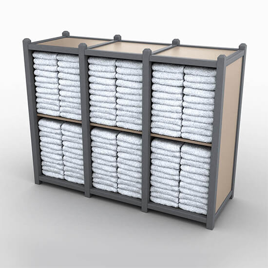 New! Larger Horizontal Towel Valets. Triple Horizontal towel storage with plain panel design includes shelves, for clean organization of your guest towels.