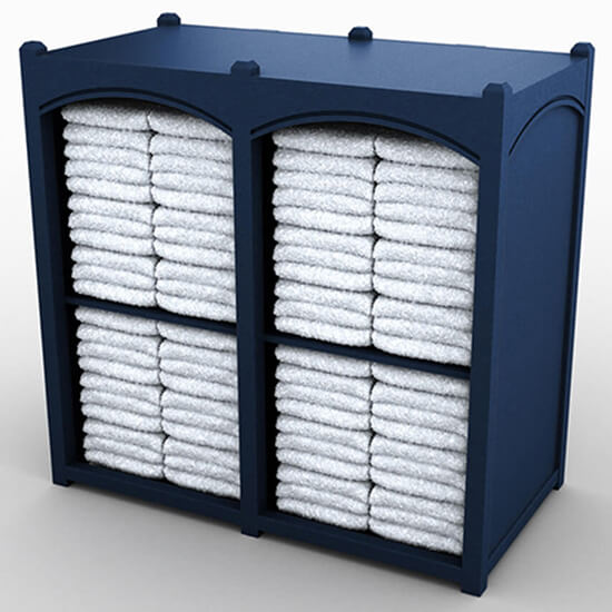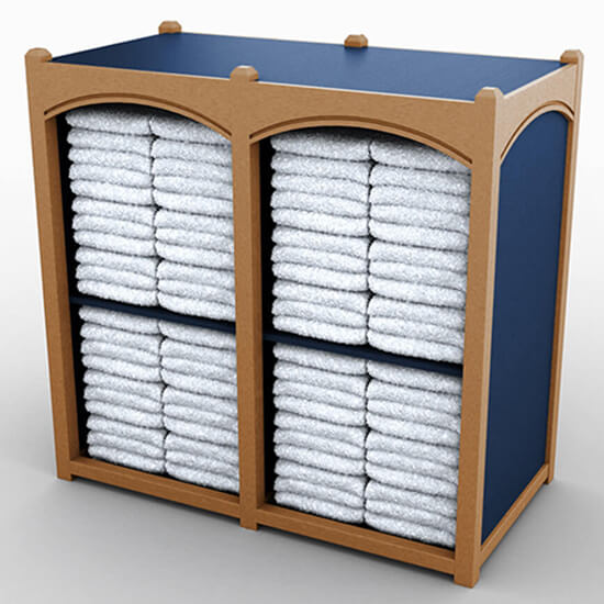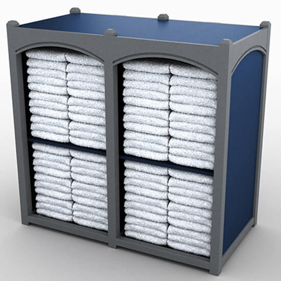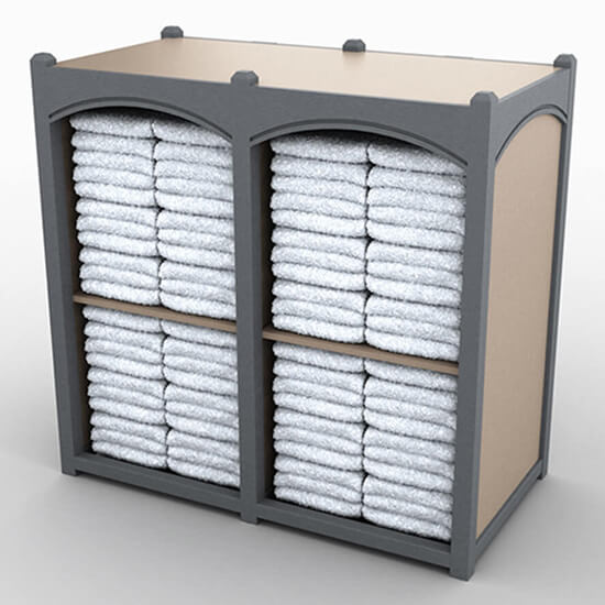Horizontal towel storage with plain panel design includes shelves, for clean organization of your guest towels.
