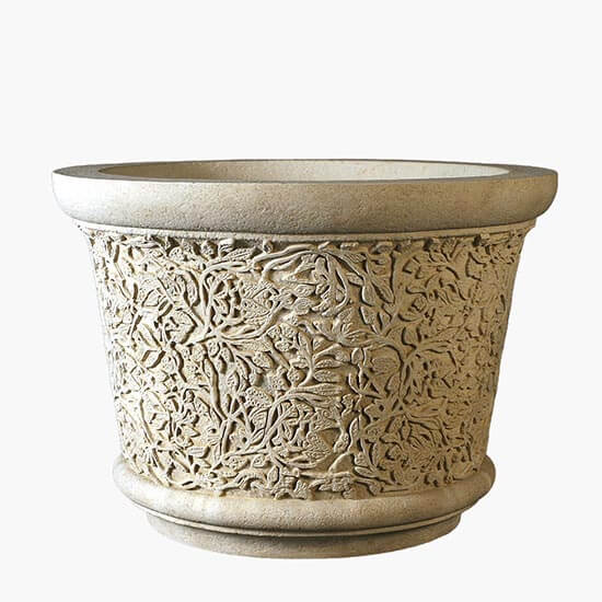Covered with delicately carved leaves, vines, and buds, no stone or concrete planter is more suited to holding lush