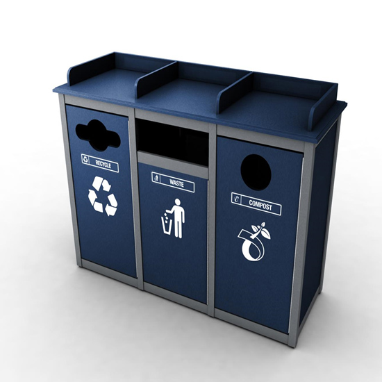 Sideload waste enclosure with plain panel design. Features waste openings on front and attached Tray receiver for café areas. All Units include hinged doors for ease of liner removal. All units include liners.