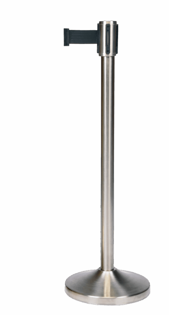 Deluxe Crowd Control Stanchion – Stainless Steel, 2-pack Stainless Steel finish 4-way adapter to attach 3 other belts 9.5 ft Retractable Black belt 24lbs. weighted base 12.5″” dia. base is compact 2-pack