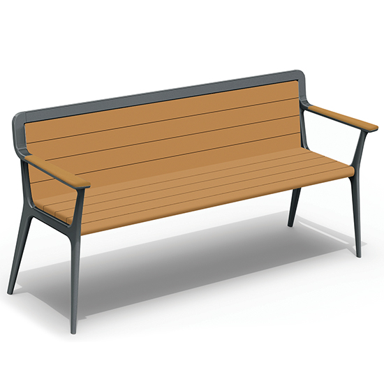 Our Elevation bench has a sturdy and supportive design that prevents tipping. The gently rounded edges won‘t catch on clothes. Designed with mobility in mind, it has an ideal seat depth and height make standing up easy. By using a fade-resistant, powder-coated steel frame, cast aluminum legs, and armrests with a state-of-the-art primer proven to prevent rusting this is a durable commercial bench. Additionally, maintenance-free recycled plastic planks never need painting or sanding. The color is uniform throughout the planks, so any scratches or scuffs during the lifetime of the bench are unnoticeable. Recycled planks are made of 95% recycled content by weight. A great choice for green companies.
