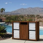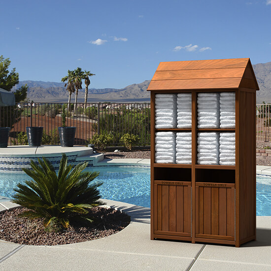 A towel caddy provides a single location for storing fresh towels and collecting used towels in a low-profile, efficient unit. A hinged door with easy to read “Towel Return” label adds convenience to its configuration. A rigid liner is included for the towel return portion.