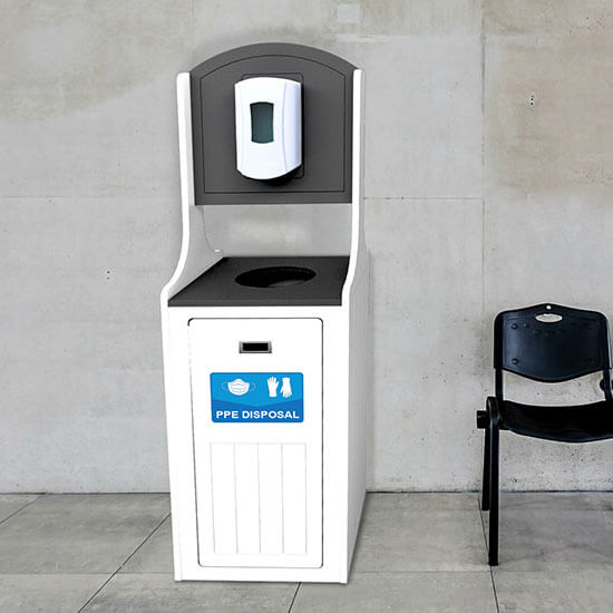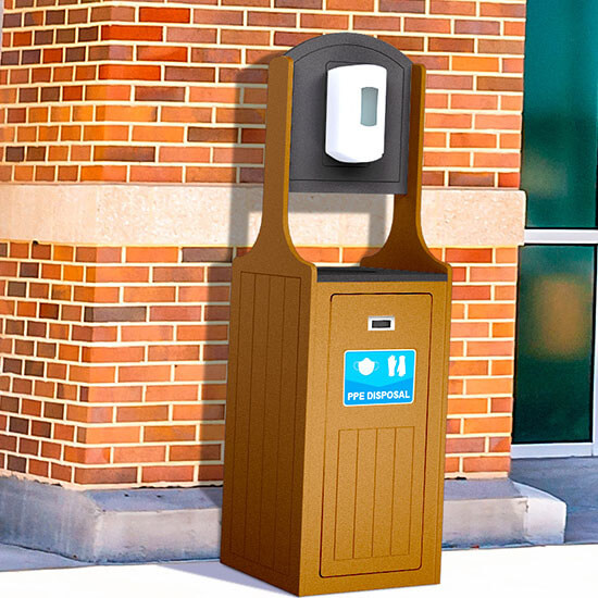 The Palisade series provides the safest and most convenient option for collecting used personal protective equipment in high-traffic areas. This multi-functional receptacle not only collects used PPE such as masks and gloves, but it also features placement for an optional sanitization dispenser to promote hand hygiene.