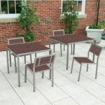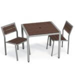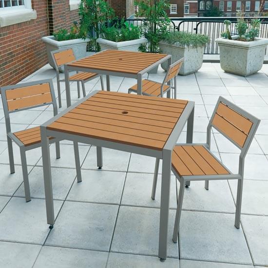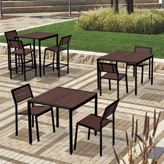 Tuscany tables and chairs deliver maximum impact with a minimalist design, with your choice of 2 colors of plastic wood planks with slim steel accents.